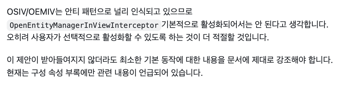 @vpavic님은 OpenEntityManagerInViewInterceptor를 기본적으로 활성화하는 것이 문제이며 opt-in 방식으로 전환하거나 최소한 문서화를 강화해야 한다고 주장했습니다.