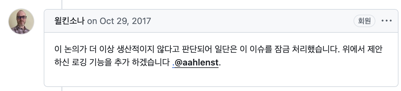 논쟁이 길어지면서 이슈는 종료되었고, 최종적으로 @aahlenst님의 제안대로 경고 메시지를 출력하는 방향으로 결정되었습니다.